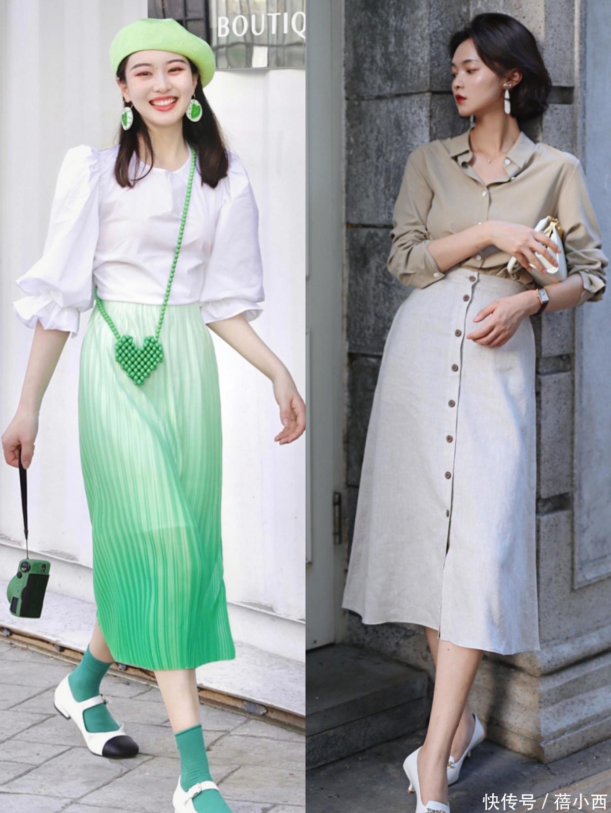 衬衫+半身裙的适用人群广泛,几乎是所有年龄段都可以去尝试的穿搭法,白衬衫/衬衣简约大气,知性优雅却不显单一,可以搭配一些渐变彩色的半身裙来提升女人味。而杏色衬衫很有风情,显白高级,搭配白色系的半身裙后形成了一种色彩递进感,温柔且典雅。